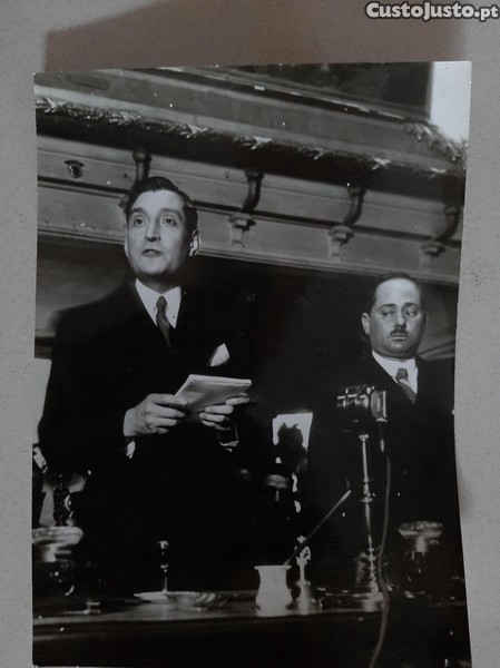Foto original de Salazar tirada em cerimónia pública, identificada e datada no verso. Verso com a inscrição: "27-5-34, Salazar agradece o título honorário dos municípios de todo o País em que é investido durante uma reunião solene no Salão Nobre da Câmara Municipal de Lisboa"