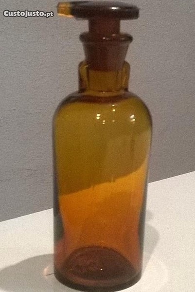 Frasco de farmácia ou de laboratório, em vidro castanho, designado por bico de pato ou conta-gotas, raro.