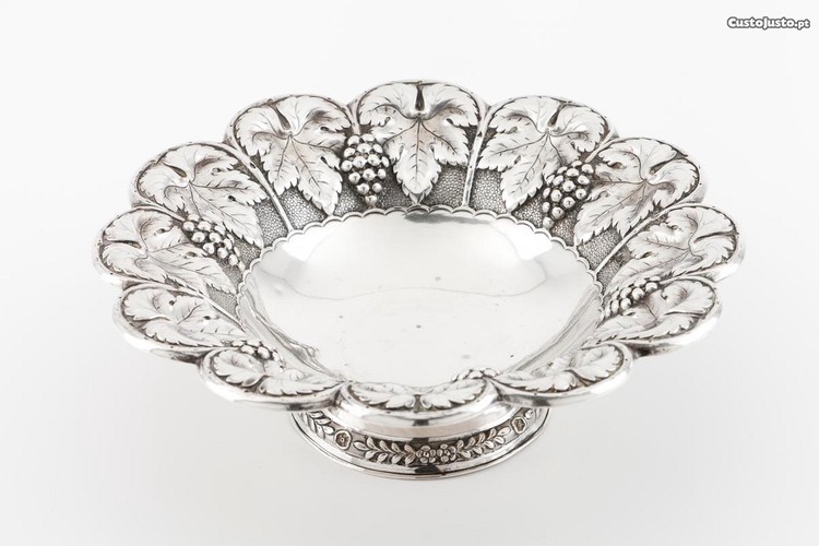 Fruteiro antigo em prata portuguesa, fundo liso com aba recortada com decoração relevada de parras e cachos de uvas contraste do Porto, " Javali "