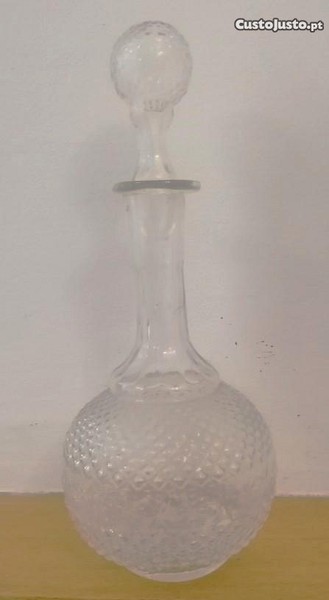 Garrafa antiga em vidro incolor soprado, com bojo e rolha de picos, da Vista Alegre, em estado de novo, com a altura de 23,5cm e diâmetro do bojo de 9,5cm.