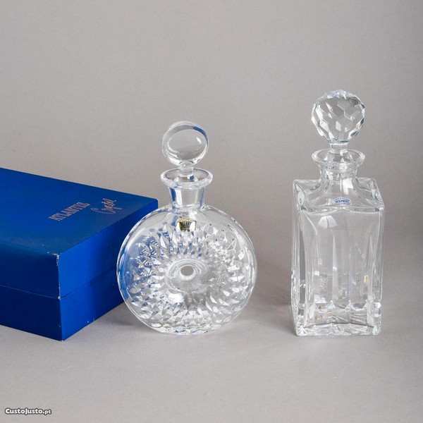 Garrafas em cristal Atlantis, decoração moldada. Uma com estojo original.