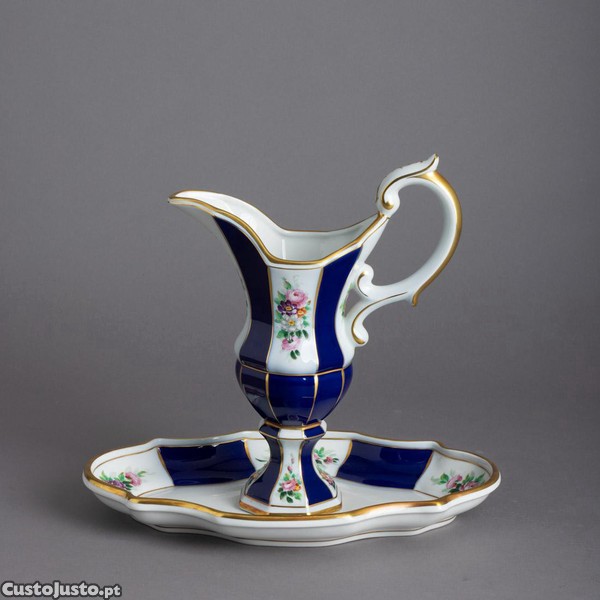 Gomil e Travessa Barros da Vista Alegre em porcelana moldada (1992-1997), decoração policromada e dourada "flores". Série limitada de 300 exemplares. Marcada e numerada.