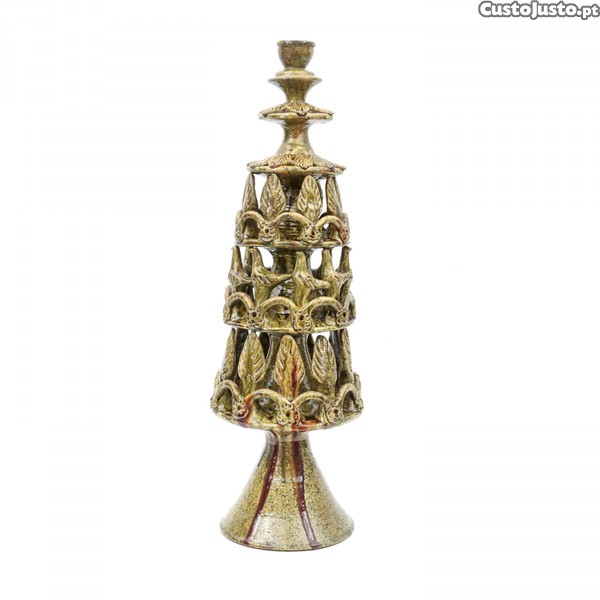 Grande castiçal em barro vidrado, assinado Rosa Ramalho. Furação de origem para candeeiro.
