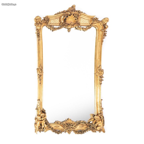 Espelho de grandes dimensões, de parede Francês, do séc. XIX, em madeira entalhada e dourada, decoração com elementos vegetalistas e puttis.