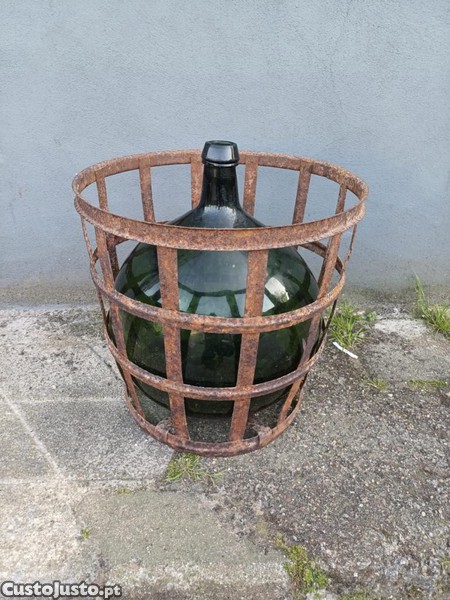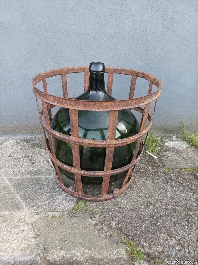 Garrafão antigo de grandes dimensões, em vidro em tons de verde. Acompanha respetiva armação de proteção em ferro.