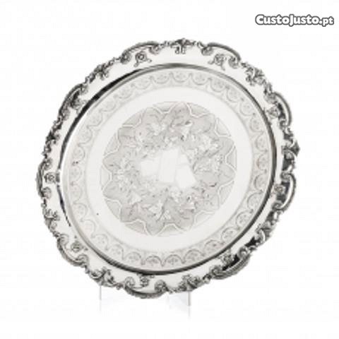 Grande Salva Bilheteira em prata portuguesa, fundo gravado e guilhochado com elementos vegetalistas, bordo recortado decorado com motivos florais, assente sobre tês pés.