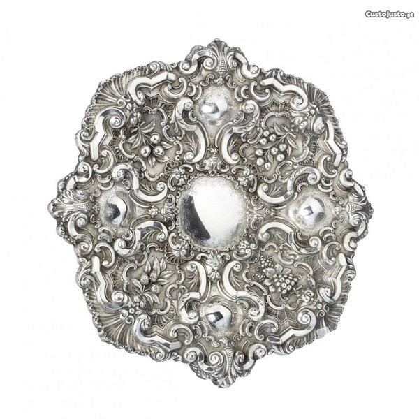 Prata portuguesa, contrastada e marcada, recortada com decoração relevada de frutos, velutas, concheado e folhagem.
