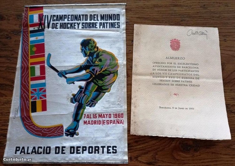 EMENTA DE 1951: Ementa do Almoço oferecido em honra dos participantes do VII Campeonato do Mundo e XVII da Europa de Hóquei em Patins, disputado na cidade de Barcelona (e com vitória da seleção espanhola). Tem vários autógrafos, nomeadamente de Igrejas Caeiro (repórter, ator e político), Domingos Lança Moreira (produtor e repórter desportivo), Rufino Sena(?) entre outras. O papel apresenta alguns picos de acidez, mas os principais defeitos estão na capa traseira, que deve ter estado colada a alguma outra superfície. Dimensões; 21x16 cm