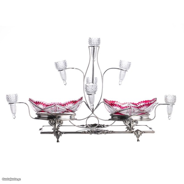 Centro de Mesa em prata portuguesa, marcada e contrastada Javali. Acompanha floreiras em cristal doublé e translúcido. Grande Plateau com 130 cm de comprimento. Invulgar peça decorativa.