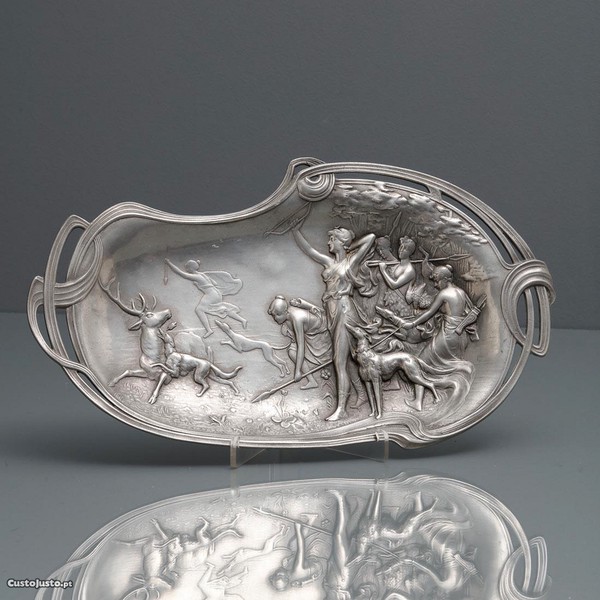 Estilo Arte Nova, estanho relevado e vazado, decorado com cena de caçada.