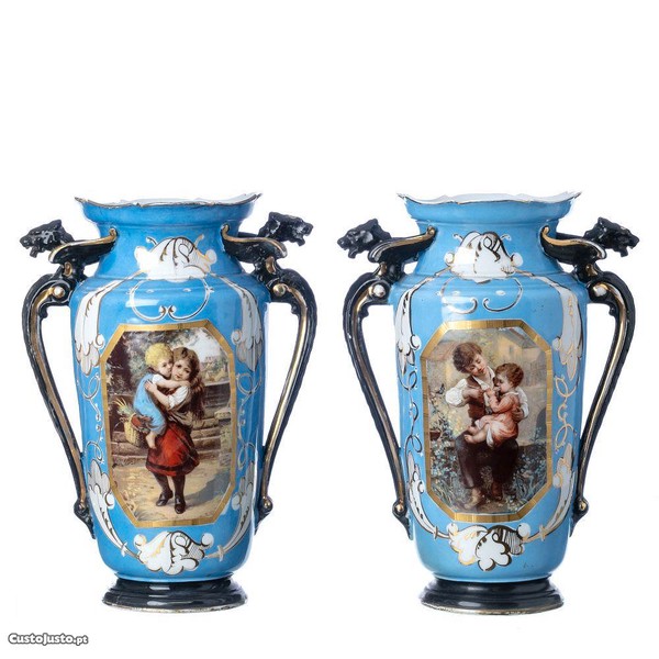 Par de Jarras Velho Paris em tom azul, com decoração figuras. Em perfeito estado de conservação.