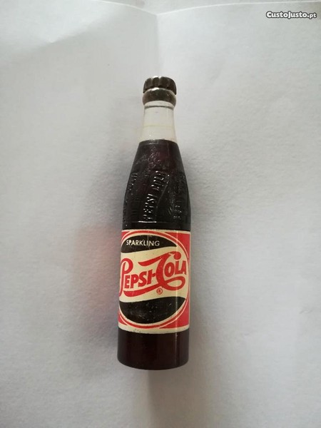 Raro e antigo isqueiro, a gasolina/benzina, com formato de garrafa miniatura de Pepsi Cola, fabricado no Michigan, USA. Tem mecha e a pedra encontra-se a funcionar perfeitamente. Decompõe-se em três partes. Mede aproximadamente 7 cm. Em bom estado estético, atendendo aos anos que tem, embora com marcas de uso e algum desgaste, nomeadamente na tampa.