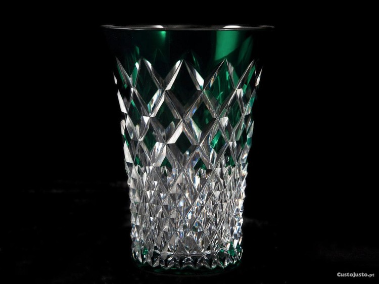 Em cristal double em tons de verde e branco, moldado e lapidado, trabalho francês do séc. XX. Corpo de formato tubular, decorado com motivos geométricos lapidados, formando um padrão repetitivo. Marcada na base por extenso (Val St Lambert).