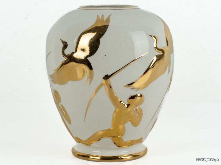 Jarra em faiança de Sacavém dos Anos 40/50 com decoração a dourado.