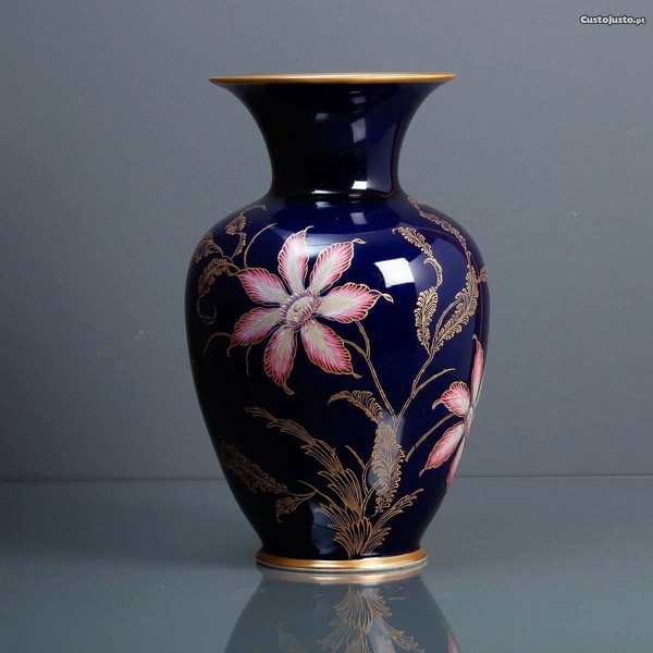 Jarra em porcelana alemã, de fundo azul cobalto decoração policromada e dourada "flores", marcada.