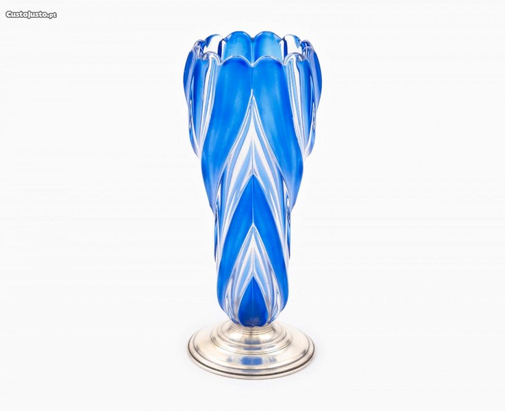Jarra em vidro doublê em tons de azul, com base em alpaca. Meados do séc. XX