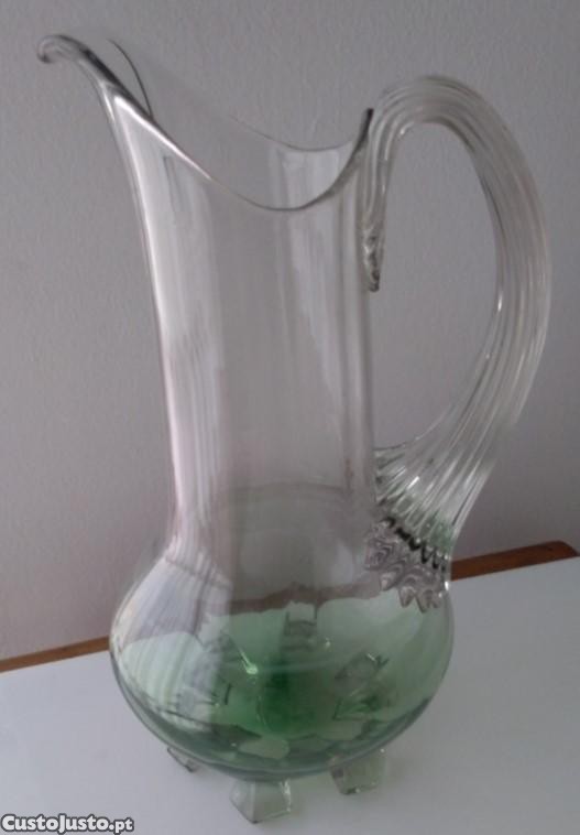Jarro em vidro antigo soprado, verde na parte inferior, com seis pés e asa estriada.