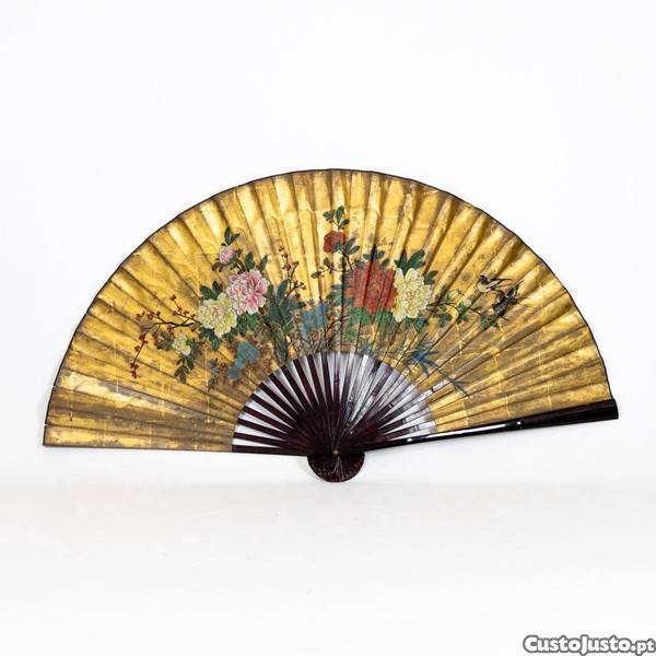 Leque Oriental de grandes dimensões com varetas em madeira lacada e aba em papel pintado com pássaros e flores.