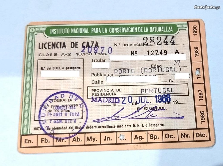 Licença de caça emitida em Espanha Comunidade de Madrid - mas titulada por cidadão português. Data de 1988. Documento curioso e em bom estado de conservação. Da mesma pessoa, acompanham esta licença outros documentos, também emitidos em Espanha, tais como o recibo do pagamento da quota anual à Real Asociación de Cazadores y Pescadores de Madrid, o recibo da licencia deportiva, também anual, paga à Federacion Espanola de Caza e os documentos do seguro obrigatório de responsabilidade civil do caçador. Todos estes documentos estão em muito bom estado estético e de conservação, pois só existem umas pequenas dobras no selo colado no verso da licença. Só vendo o conjunto e o preço é fixo.