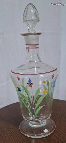 Licoreiro em vidro incolor, com pintura floral a pena