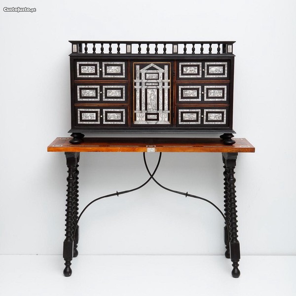 Revestido a diferentes madeiras, nicho central e seis gavetas com placas em osso gravado representando cenas de caça e animais. Pernas torneadas em madeira escurecida.