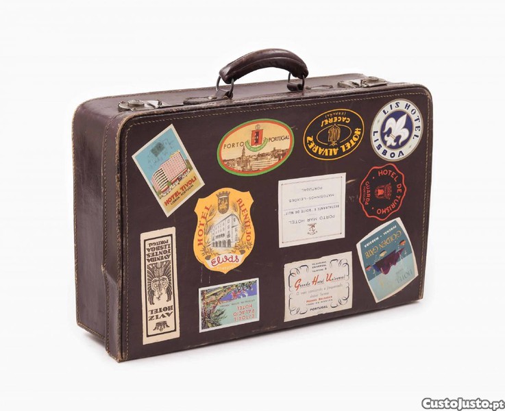 Mala de viagem antiga em cartão e couro, com interior forrado a tecido, e diversas etiquetas de hotéis no exterior.