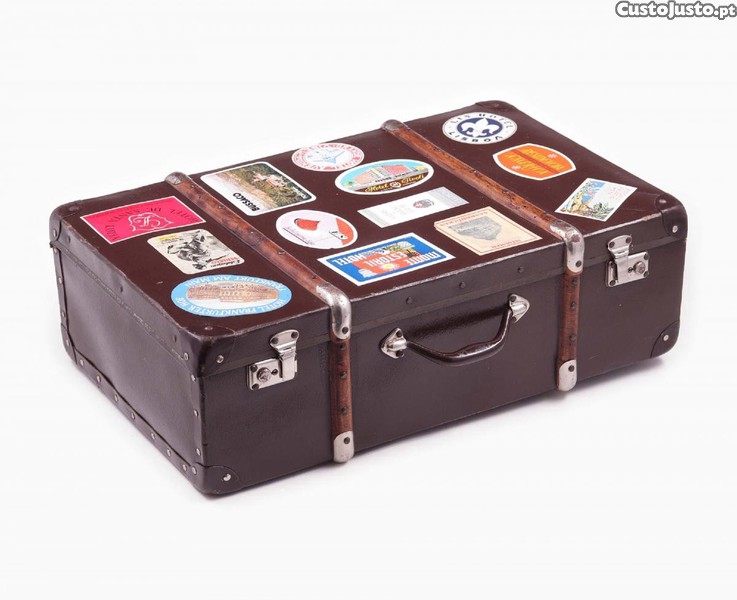 Mala de viagem antiga em madeira, couro e metal, com diversas etiquetas de hotéis.