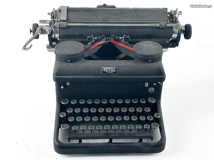 Máquina de escrever marca Royal, estrutura em ferro, teclado redondo.