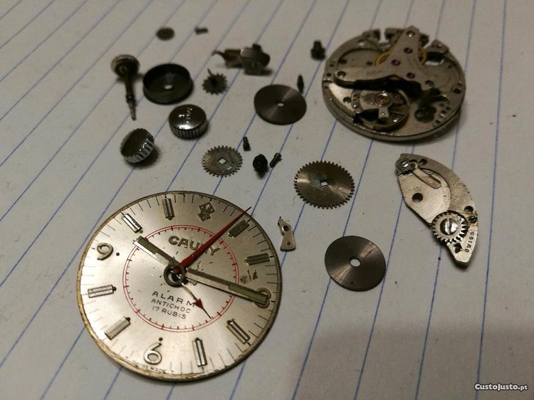 Máquina relógio antigo cauny alarme, para peças ou restauro, movimento praticamente completo, tem mostrador e 4 ponteiros , mostrador com algumas marcas ,tem o martelo do alarme e tem uma das coroas com a marca cauny, ver fotos.