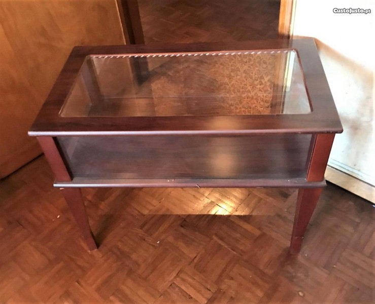 Mesa vitrine em madeira do séc. XX com tampo e lados envidraçados, sendo o tampo de levantar.