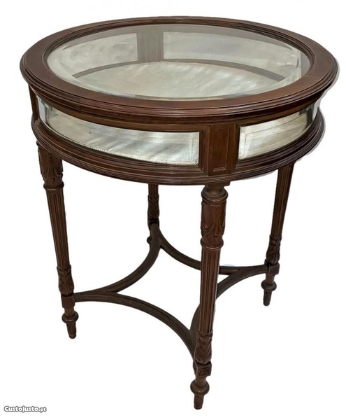 Mesa-vitrine estilo Luís XVI, redonda, em mogno com trabalho de talha.
