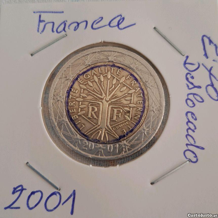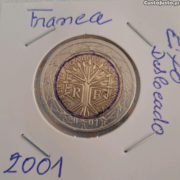 Moeda de dois euros, francesa, emitida no ano de 2001,Esta moeda tem no verso uma árvore da vida e o lema da república gaulesa Liberté, Egalité, Fraternité.O erro na cunhagem, é que o eixo central da moeda encontra-se deslocado, bem como algumas das estrelas!