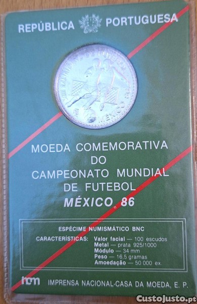 Moeda BNC prata 925, com o peso de 16,5grs., de 100 Escudos, comemorativa do Campeonato Mundial de Futebol México 86, com uma emissão de 50.000 exemplares, em carteira original.
