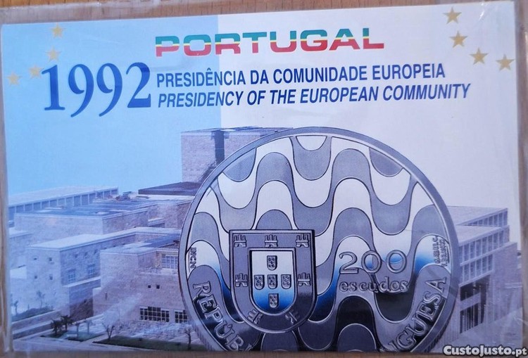Moeda em prata BNC 925, de 200$00, comemorativa da Presidência Portuguesa da Comunidade Europeia, de 1992, com o diâmetro de 36mm, sendo autores: Isabel Carriço e Fernando Branco; emissão de 20.000 exemplares, com o peso de 26,5grs..