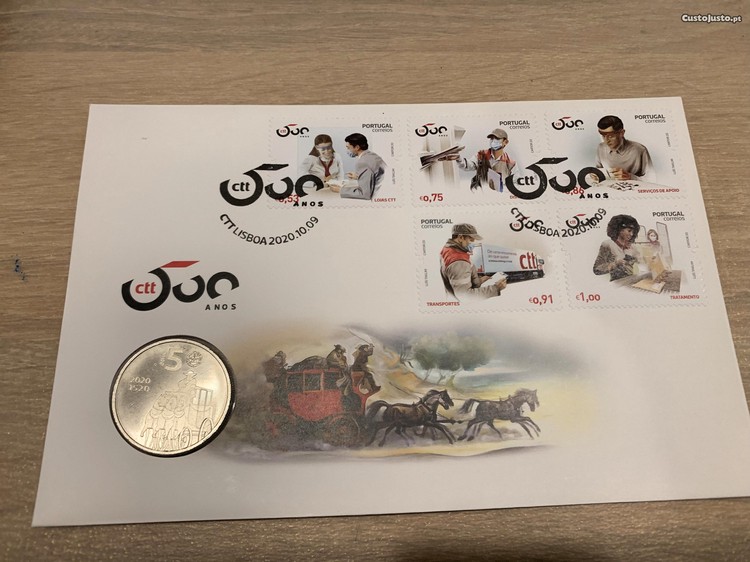 Envelope com moeda comemorativa dos 500 anos dos CTT