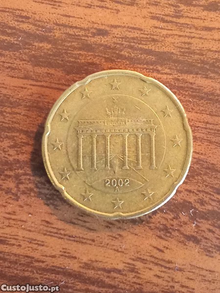 Vendo moeda de 20 cêntimos de 2002 letra A da Alemanha . Em muito bom estado, como mostram as fotos.