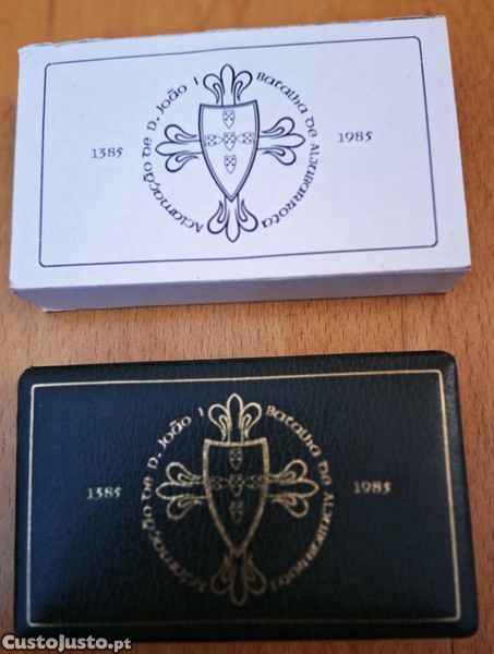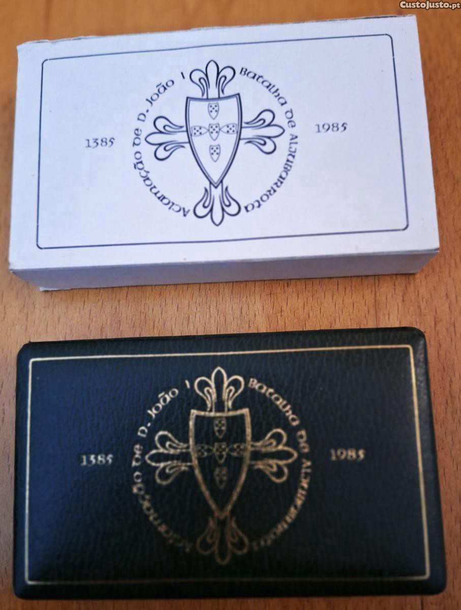 Estojo com cinta exterior e certificado de garantia contendo moedas em prata 925 Proof, de 25 Escudos e de 100 Escudos de 1985, comemorativas da Aclamação de D. João I, Batalha de Aljubarrota, com tiragem de 5.000 exemplares, módulos de 28,5mm e de 34mm, respectivamente, peso de 11g. e de 16,5g..