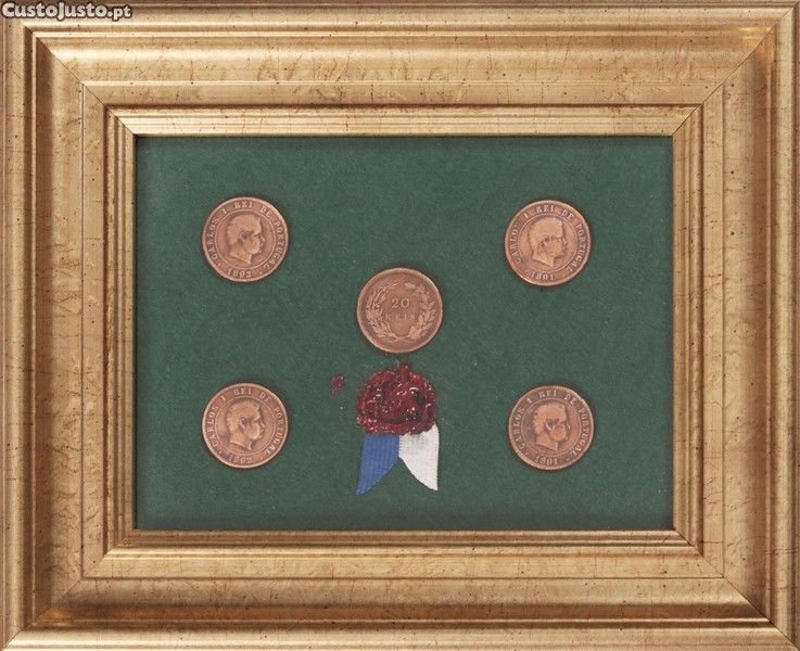 Moldura em madeira e vidro com 5 moedas 20 Reis, D. Carlos I, 1891/92 em bronze.