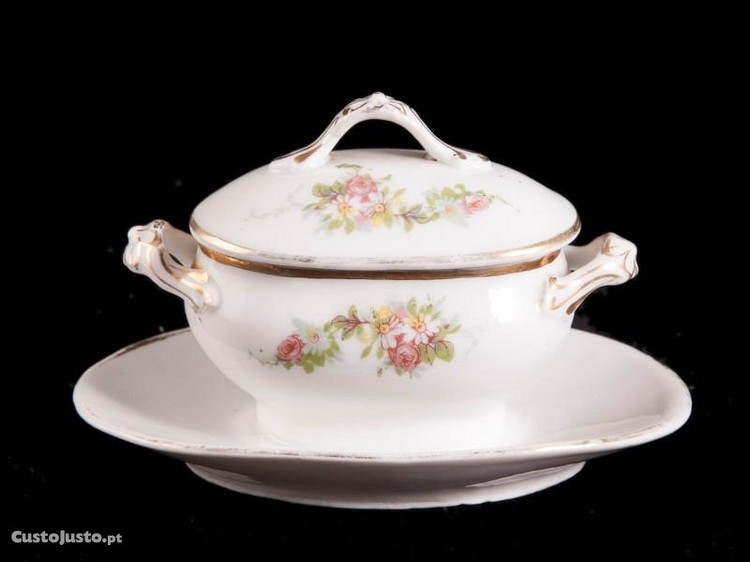 Mostardeira em forma de terrina com travessinha, em porcelana moldada e relevada da fábrica da Vista Alegre. Decoração estampilhada e policroma em vários tons sobre fundo branco com motivos florais, filagens e complementos a ouro mate. Marca por carimbo na base.