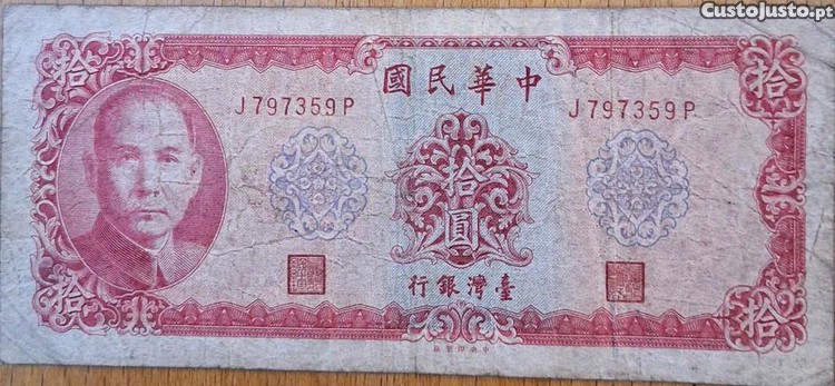 Nota de 10 Yuan da China (Taiwan), 1969. Condições de entrega à data do anúncio: Grátis, para a entrega em mão no Porto (local e hora a combinar), apenas de artigos de custo igual ou superior a 30EUR, ou: Para outras localidades, dentro do território nacional português, contra o pagamento por transferência bancária do preço acordado, mais custos de envio de 1,60EUR pelos CTT, em correio normal. Para o resto do mundo, só atendo e respondo por e-mail ou WhatsApp, com transferência bancária do preço acordado, mais custos de envio a ajustar. Só envio à cobrança mediante o pagamento antecipado das despesas de envio, por transferência bancária.