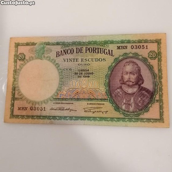 Nota do Banco de Portugal, de vinte escudos de 28 de Junho de 1949, Chapa 6, de D. António Luiz de Menezes.
