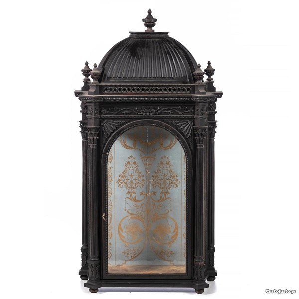 Oratório antigo em madeira português, neoclássico em madeira de pau-santo com entalhamentos, colunas torneadas, cúpula gomada, interior pintado e dourado.