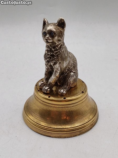 Representação de um gato com olhos em vidro, assente em base de prata dourada.