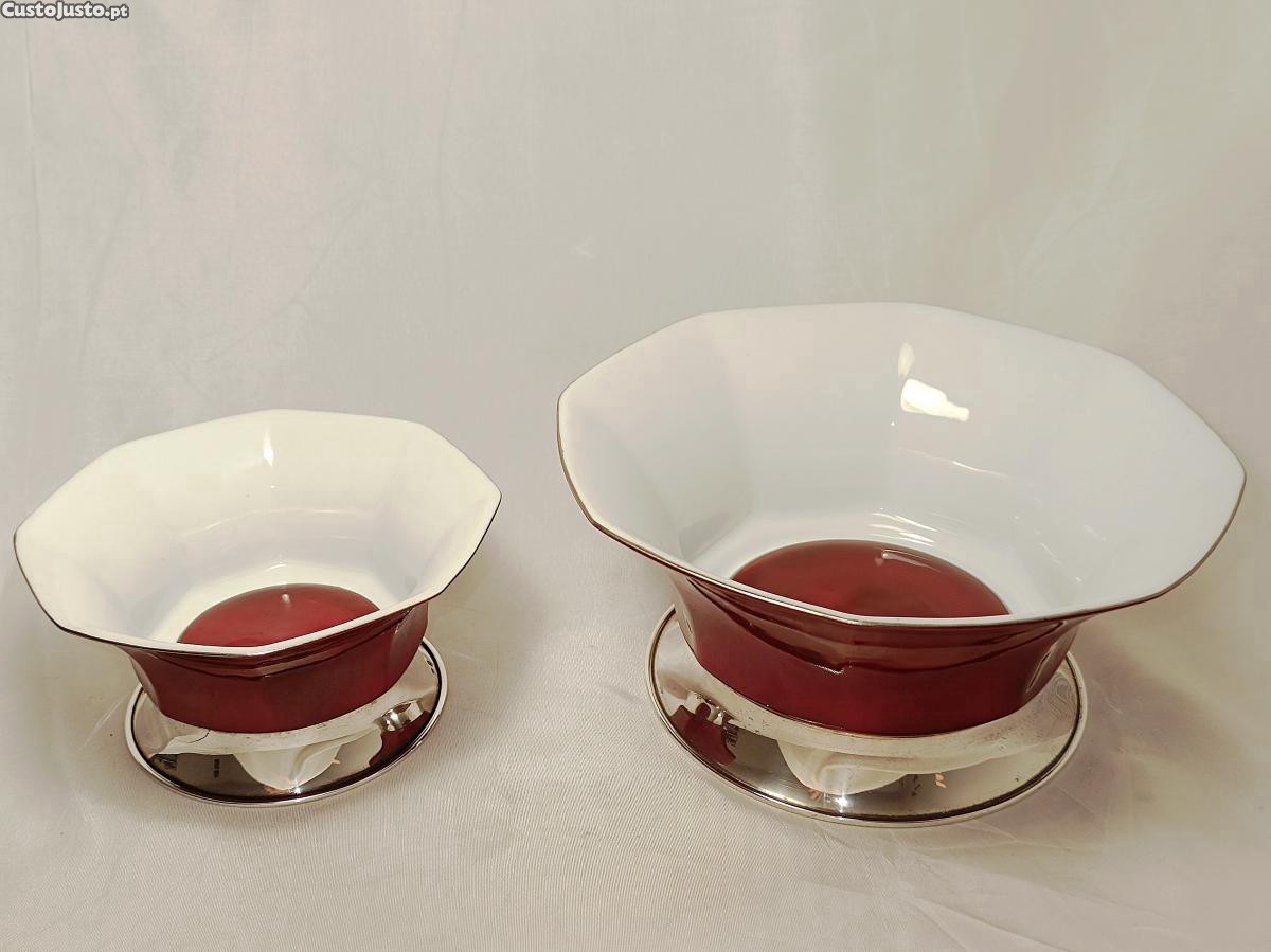 Par de bomboneiras em porcelana portuguesa com base em prata, marcada e contrastada.