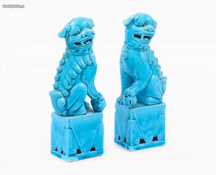 Par de Cães de Foo Orientais em porcelana azul turquesa.