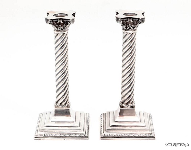 Par de Castiçais "Colunas com Capitéis" em Prata Portuguesa