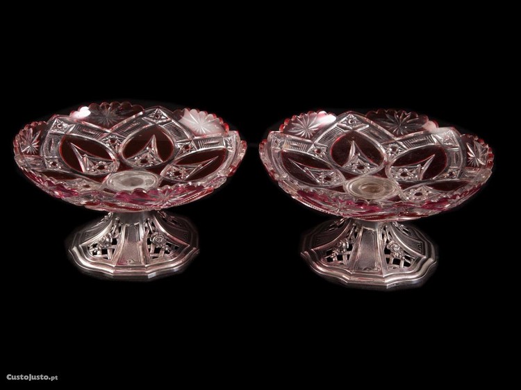 Par de fruteiros em cristal doblé em tons de vermelho e translúcido, moldado e lapidado com bases em prata portuguesa, marcada e contrastada com punção "Javali". Trabalho do séc. XIX-XX.