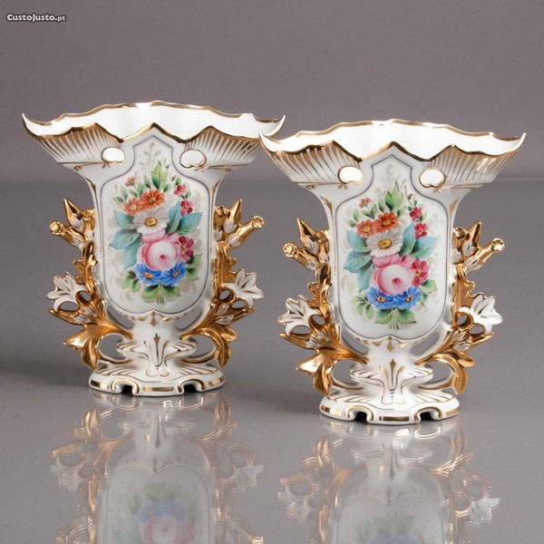 Par de jarras antigas em porcelana moldada (1947-1968), decoração policromada e dourada "flores".