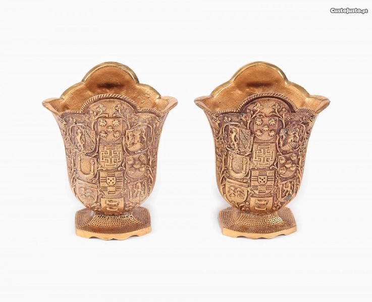 Par de jarras em bronze relevado e dourado, com decoração representando caravelas portuguesas e brasões de armas de Portugal.