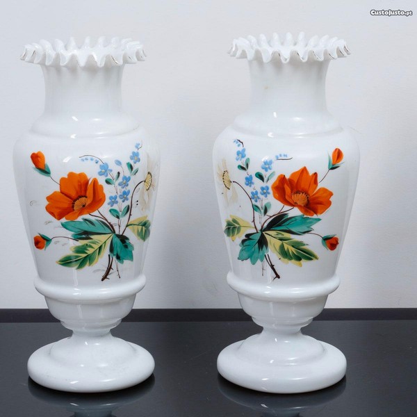 Par de jarras em vidro opalino pintado, decoração floral policroma, bordo ondulado. Estado impecável.